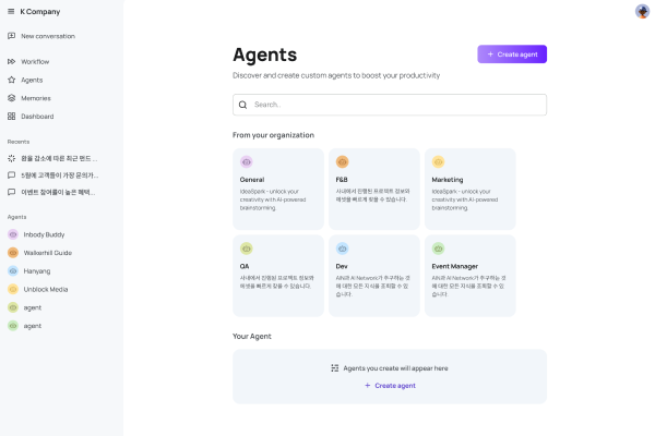 - Intent 기반 업무 자동화 기술: 사용자의 자연어 질문을 실시간 분석하여 업무 의도를 파악하고, 복잡한 비즈니스 프로세스를 에이전트가 자율적으로 실행하는 워크플로우 자동화 기술