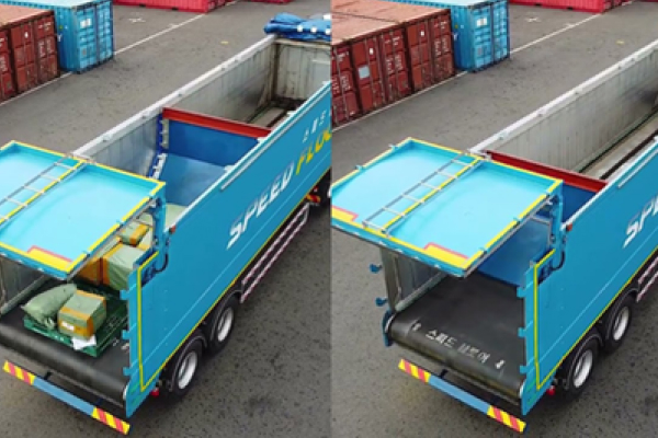 - 화물차 적재함 내부에 컨베이어벨트로 구성된 상하차 자동화 시스템
